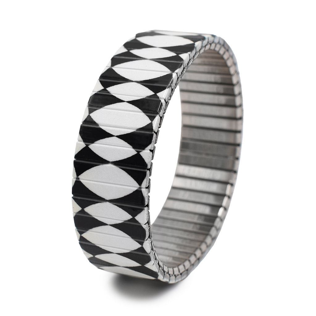 Optische Kunst in ihrer schönsten Form. Inspiriert von Bridget Rileys schwindelerregenden Illusionen, verwandelt dieses Armband Schwarz und Weiß in tragbare Bewegung.
