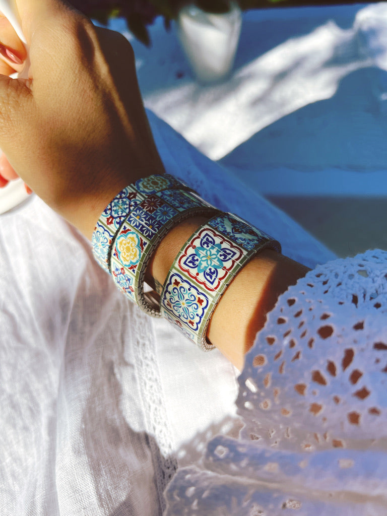 Unsere lebendigen "AZULEJO BANDEDS" sind inspiriert von den kunstvollen portugiesischen Steinfliesen, welche in wunderbarer Handarbeit gefertigt, hunderte Häuser und Böden schmücken. Wir empfehlen in der Hektik des Alltags ab und zu einen Blick beim Tragen darauf zu werfen und für einen Moment inne zu halten - beruhigt ungemein!