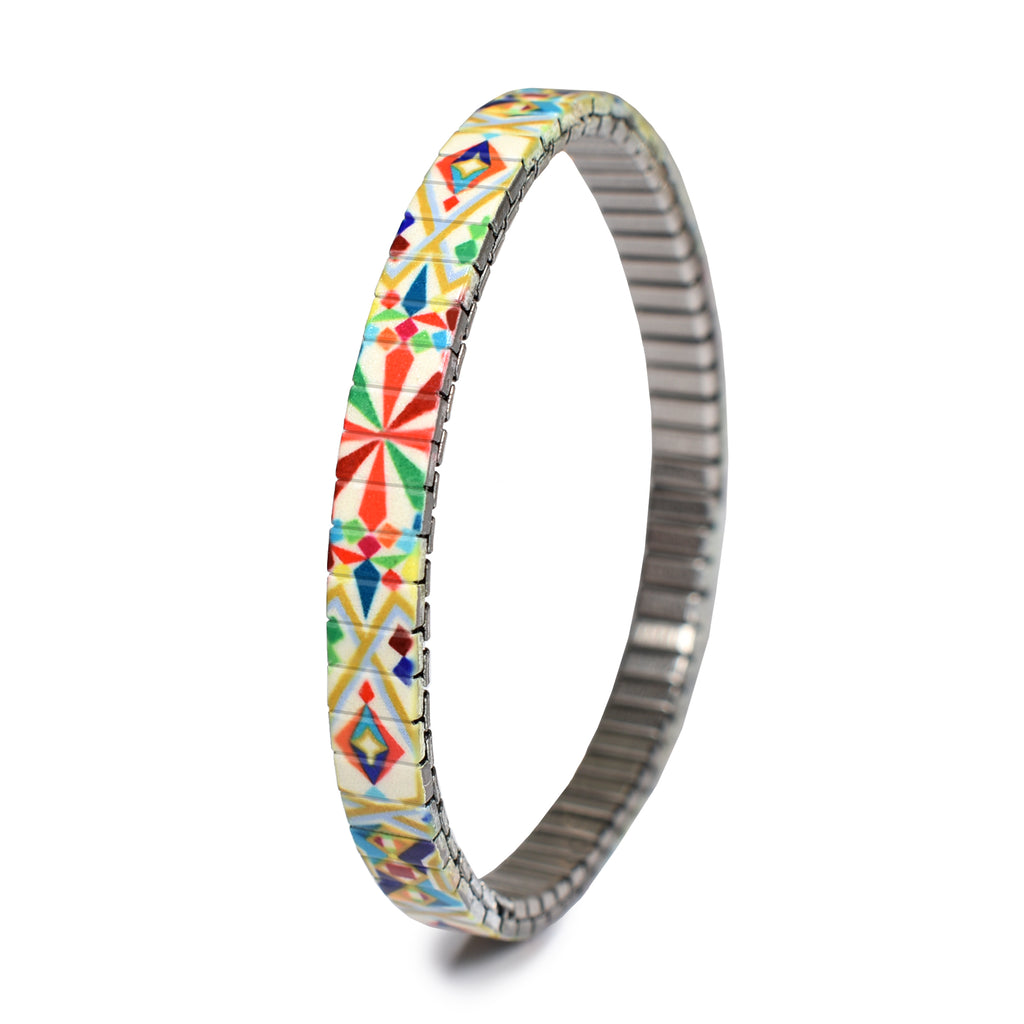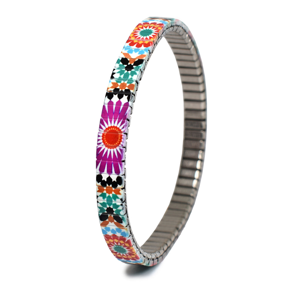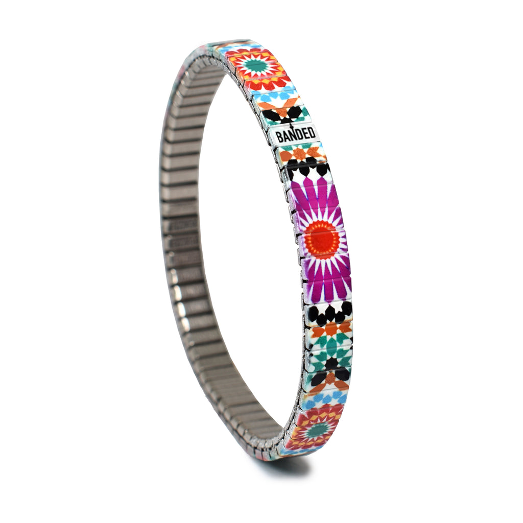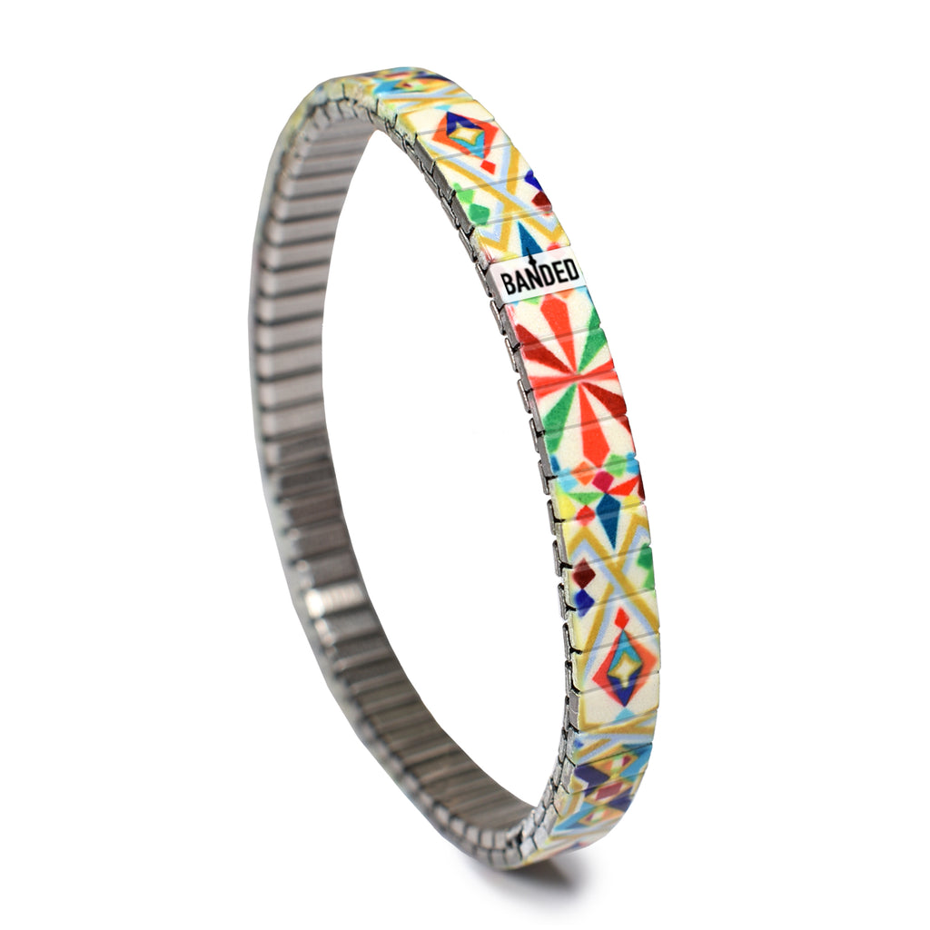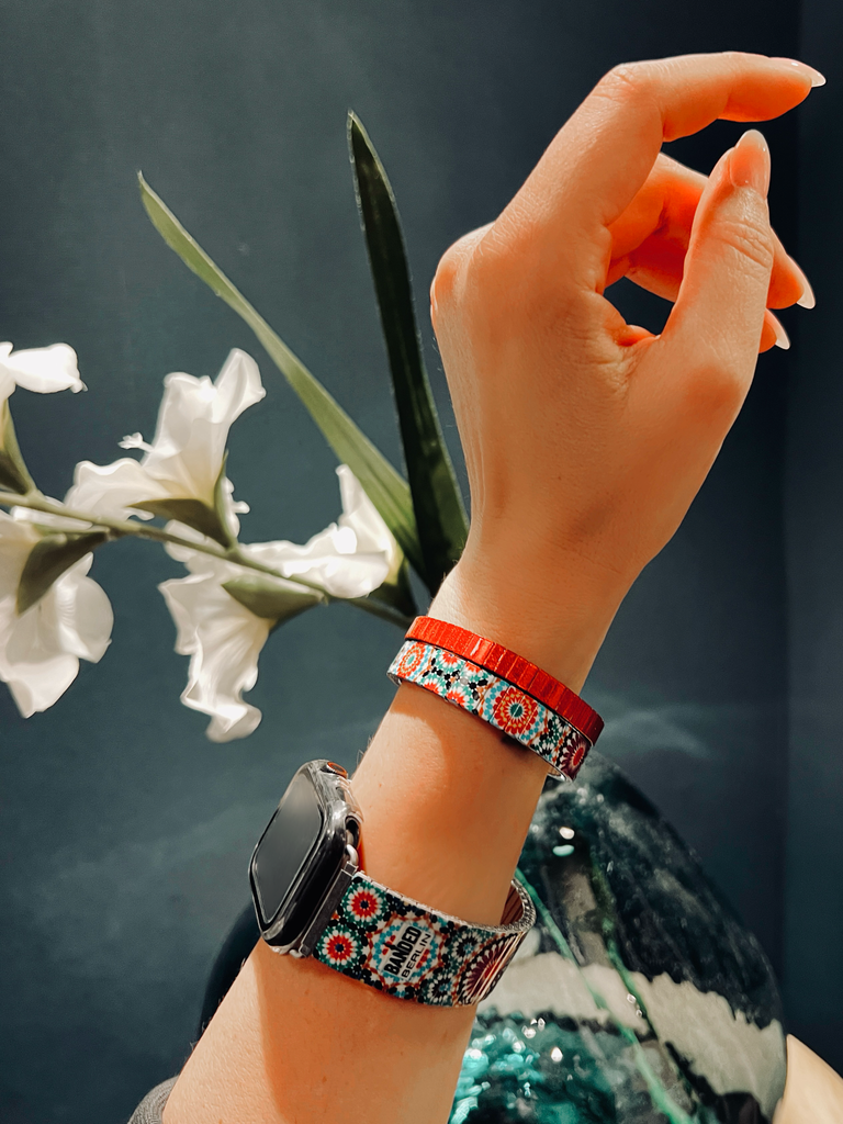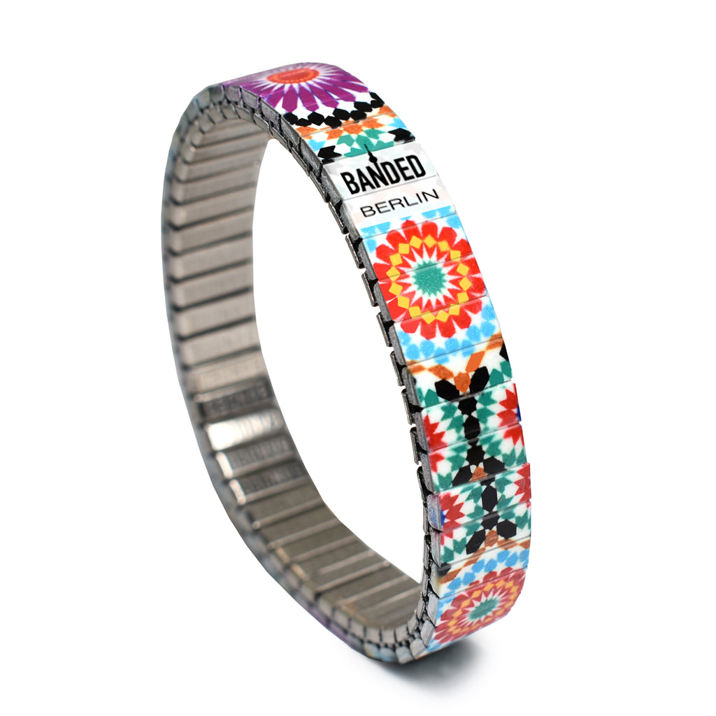 Our "Azulejos" collection is a line of Bandeds inspired by the rich tradition of azulejo tiles from the Iberian Peninsula. This collection captures the intricate geometric patterns and vibrant colours that characterise these celebrated ceramic tiles. Each bracelet in the series features designs that are meticulously laid out to reflect the artistry and historical depth of the azulejo craft. Hand-crafted in Berlin, these bracelets not only mimic the lustrous sheen of ceramic but also offer a modern twist on a timeless art form. Perfect for those who appreciate cultural history woven into wearable art, the "Azulejos" collection brings a touch of Mediterranean charm to any outfit.