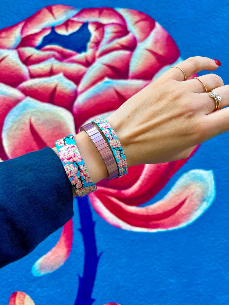 Dive into the ethereal beauty of spring with our Cherry Blossom Banded, a piece that captures the fleeting elegance of cherry blossoms in full bloom. Blue and Turquoise gradient background with Pink and Cream Flowers