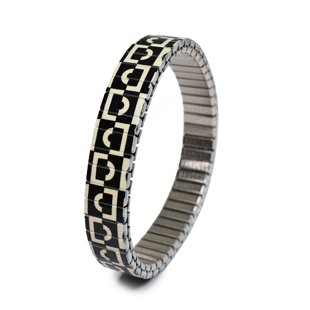 Introducing the "Shimmy Shimmy Shake" Banded, a bold and playful design inspired by the dynamic black-and-white patterns of 1960s design. This statement piece features intricate, eye-catching geometric pattern that captures the essence of the era's avant-garde aesthetic. The high-contrast black and white design shimmies with movement, creating a hypnotic visual effect that brings energy and flair to any outfit. Perfect for those who love retro vibes with a modern twist, the "Shimmy Shimmy Shake" bracelet is a must-have for anyone looking to add a dash of vintage cool to their style.