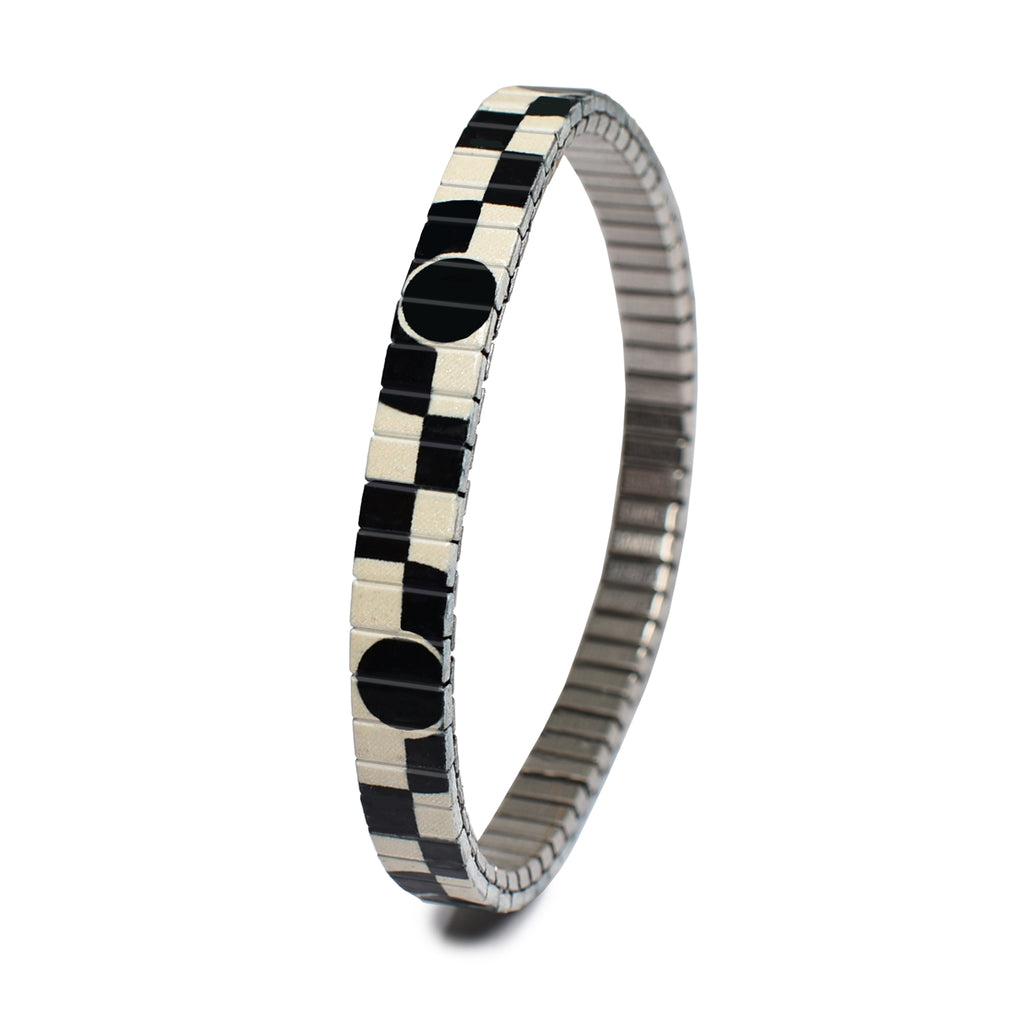 Introducing the "Shimmy Shimmy Shake" Banded, a bold and playful design inspired by the dynamic black-and-white patterns of 1960s design. This statement piece features intricate, eye-catching geometric pattern that captures the essence of the era's avant-garde aesthetic. The high-contrast black and white design shimmies with movement, creating a hypnotic visual effect that brings energy and flair to any outfit. Perfect for those who love retro vibes with a modern twist, the "Shimmy Shimmy Shake" bracelet is a must-have for anyone looking to add a dash of vintage cool to their style.