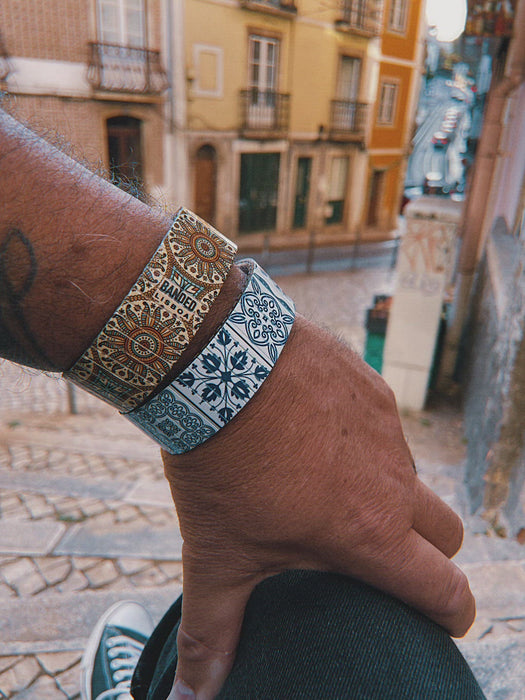 Unsere lebendigen "AZULEJO BANDEDS" sind inspiriert von den kunstvollen portugiesischen Steinfliesen, welche in wunderbarer Handarbeit gefertigt, hunderte Häuser und Böden schmücken. Wir empfehlen in der Hektik des Alltags ab und zu einen Blick beim Tragen darauf zu werfen und für einen Moment inne zu halten - beruhigt ungemein!