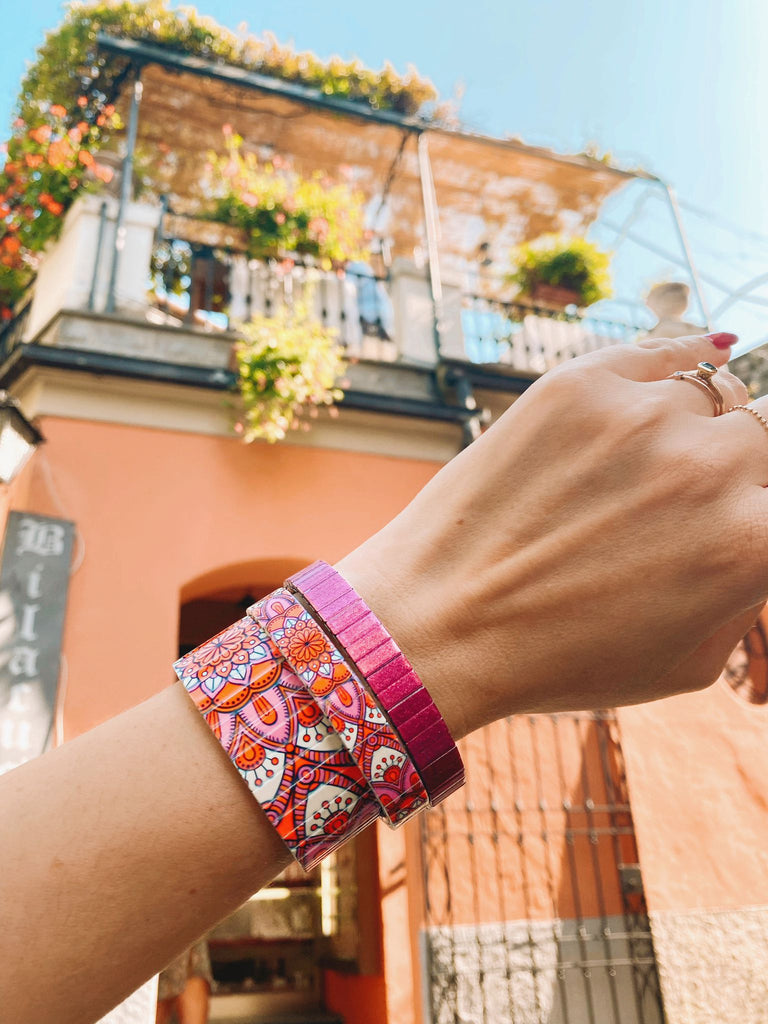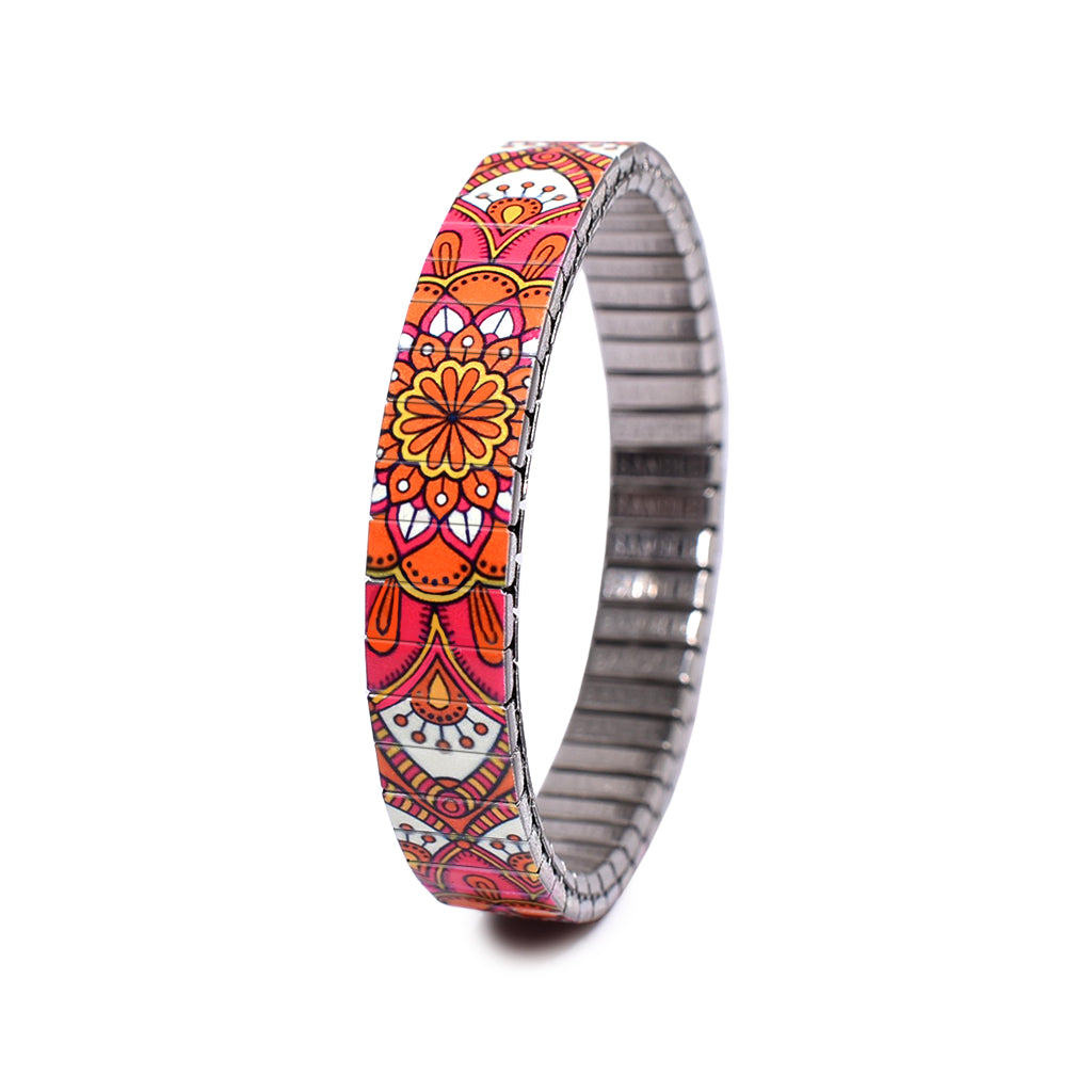 Florale Muster in warmen Orangetönen, Safrangelb und leuchtendem Pink - verheißungsvoll wie der Sonnenuntergang am Strand von Tel Aviv. Ein erfrischender Design-Cocktail für Deinen ewigen Sommer.